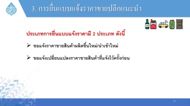 3. การยื่นแบบแจ้งราคาขายปลีกแนะน า ประเภทกำรยื่นแบบแจ้งรำคำมี 2 ประเภท ดังนี้ ขอแจ้งรำคำขำยสินค้ำผลิตขึ้นใหม่/น ำเข้ำใหม่ ขอแจ้งเปลี่ยนแปลงรำคำขำยสินค้ำที่แจ้งไว้ครั้งก่อน 16