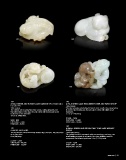 A PALE GREEN AND RUSSET JADE CARVING OF A TOAD ON A A PALE GREEN JADE RECUMBENT DEER AND FAWN GROUP
