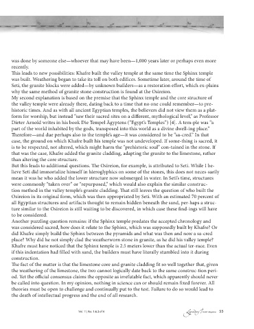 If Khafre had built both, his valley temple and the Sphinx temple using nothing but limestone od. Yet the offi cial consensus claims the opposite as irrefutable fact, which apparently should never