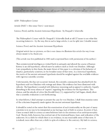 Th e Philosopher’s Corner with Dr. Pasqual S. Schievella (look at old LT issues to see what this claiming for it more than it can deliver and by refusing to give the ancient astronaut hypothesis