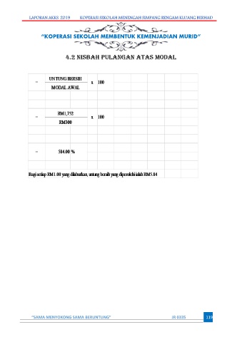 LAPORAN AKKS 2019 KOPERASI SEKOLAH MENENGAH SIMPANG RENGAM KLUANG BERHAD “KOPERASI SEKOLAH MEMBENTUK KEMENJADIAN MURID” 4.2 NISBAH PULANGAN ATAS MODAL “SAMA MENYOKONG SAMA BERUNTUNG” JR 0335 119