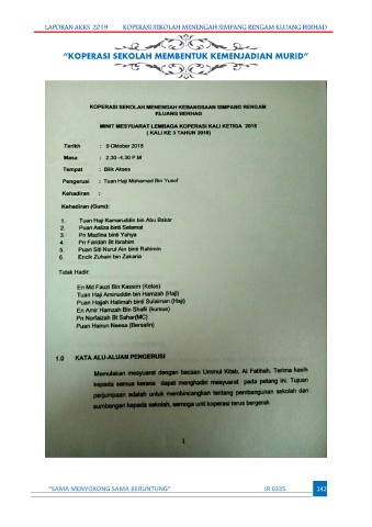 LAPORAN AKKS 2019 KOPERASI SEKOLAH MENENGAH SIMPANG RENGAM KLUANG BERHAD “KOPERASI SEKOLAH MEMBENTUK KEMENJADIAN MURID” “SAMA MENYOKONG SAMA BERUNTUNG” JR 0335 142