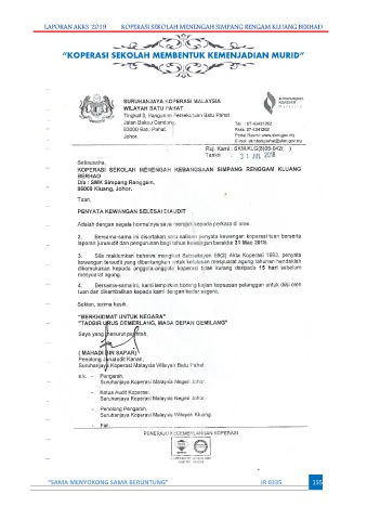 LAPORAN AKKS 2019 KOPERASI SEKOLAH MENENGAH SIMPANG RENGAM KLUANG BERHAD “KOPERASI SEKOLAH MEMBENTUK KEMENJADIAN MURID” “SAMA MENYOKONG SAMA BERUNTUNG” JR 0335 155