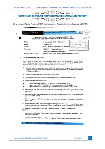 LAPORAN AKKS 2019 KOPERASI SEKOLAH MENENGAH SIMPANG RENGAM KLUANG BERHAD “KOPERASI SEKOLAH MEMBENTUK KEMENJADIAN MURID” 5.2 Mesyuarat Agung Tahunan (MAT) dan Mesyuarat Anggota Lembaga Koperasi (ALK) (5%) “SAMA MENYOKONG SAMA BERUNTUNG” JR 0335 14