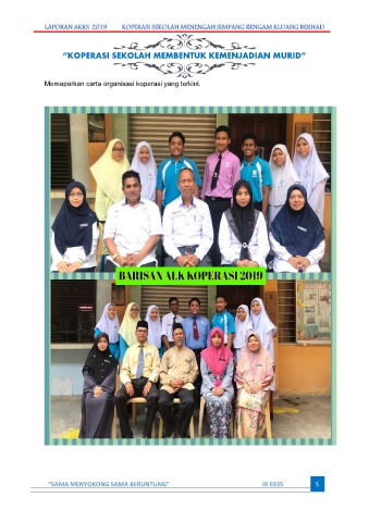 LAPORAN AKKS 2019 KOPERASI SEKOLAH MENENGAH SIMPANG RENGAM KLUANG BERHAD “KOPERASI SEKOLAH MEMBENTUK KEMENJADIAN MURID” Memaparkan carta organisasi koperasi yang terkini. “SAMA MENYOKONG SAMA BERUNTUNG” JR 0335 5