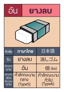 อัน Âҧź หัวข้อ ภาษาไทย 日本語 ่ ชือ ยางลบ 消しゴム ลักษณะ อัน นาม 個 (ko) ประเภท คําลักณะนามคําลักณะนาม ของ กลาง ่ ลักษณะ ทัวไป นาม (Type5) (Type6)
