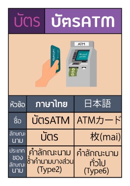 บัตร ºÑµÃATM หัวข้อ ภาษาไทย 日本語 ่ ชือ บัตรATMATMカード ลักษณะ บัตร นาม 枚 (mai) ประเภท คําลักณะนามคําลักณะนาม ของ ่ ซําคํานามบางส่วน ลักษณะ ทัวไป นาม (Type2) (Type6)