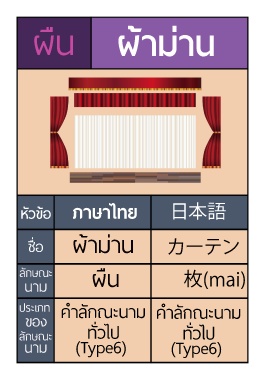 ผืน ผ้าม่าน หัวข้อ ภาษาไทย 日本語 ่ ชือ ผ้าม่าน カーテン ลักษณะ ผืน นาม 枚 (mai) ประเภท คําลักณะนามคําลักณะนาม ของ ่ ่ ลักษณะ ทัวไป ทัวไป นาม (Type6) (Type6)