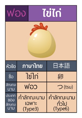 ฟอง 䢋䡋 หัวข้อ ภาษาไทย 日本語 ่ ชือ ไข่ไก่ 卵 ลักษณะ ฟอว นาม つ (tsu) ประเภท คําลักณะนามคําลักณะนาม ของ ่ ลักษณะ เฉพาะ ทัวไป นาม (Type3) (Type6)
