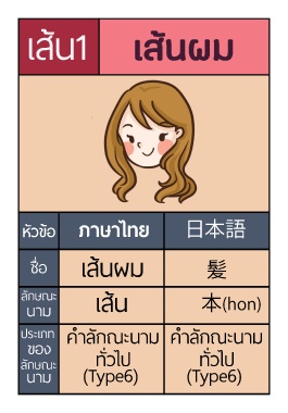 เส้น1 àÊŒ¹¼Á หัวข้อ ภาษาไทย 日本語 ่ ชือ เส้นผม 髪 ลักษณะ เส้น นาม 本 (hon) ประเภท คําลักณะนามคําลักณะนาม ของ ่ ่ ลักษณะ ทัวไป ทัวไป นาม (Type6) (Type6)