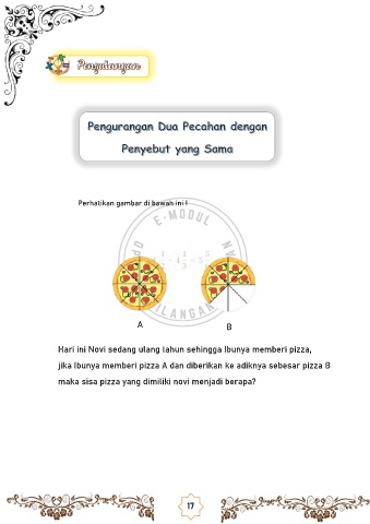 Perhatikan gambar di bawah ini ! A B Hari ini Novi sedang ulang tahun sehingga Ibunya memberi pizza, jika Ibunya memberi pizza A dan diberikan ke adiknya sebesar pizza B maka sisa pizza yang dimiliki novi menjadi berapa? 17