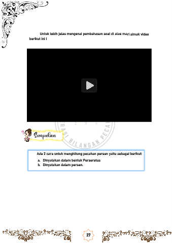 Untuk lebih jelas mengenai pembahasan soal di atas mari simak video berikut ini ! Ada 2 cara untuk menghitung pecahan persen yaitu sebagai berikut: a. Dinyatakan dalam bentuk Perseratus b. Dinyatakan dalam persen. 27