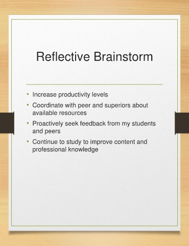 Reflective Brainstorm • Increase productivity levels • Coordinate with peer and superiors about available resources • Proactively seek feedback from my students and peers • Continue to study to improve content and professional knowledge