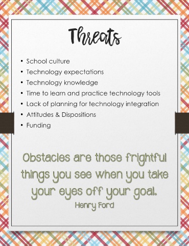 Threats • School culture • Technology expectations • Technology knowledge • Time to learn and practice technology tools • Lack of planning for technology integration • Attitudes & Dispositions • Funding