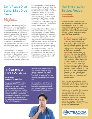 For our continued commitment to patient privacy and confidentiality, remember: only share information with those employees that need to know because of their job duties.