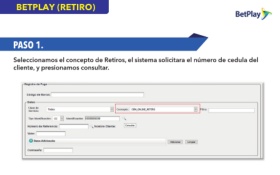 BETPLAY (RETIRO) PASO 1. Seleccionamos el concepto de Retiros, el sistema solicitara el número de cedula del cliente, y presionamos consultar.