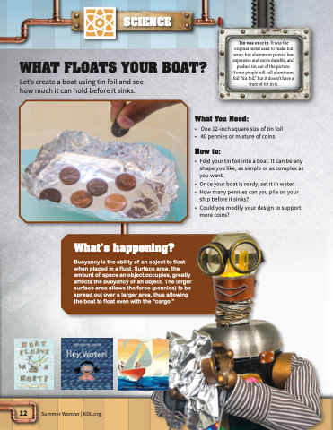 Buoyancy is the ability of an an object to float when placed in a a a a a fluid Surface area the amount of space an object occupies greatly affects the buoyancy of an an object The larger surface area allows the force (pennies) to be spread out over a a a a a a larger area thus allowing the the boat to float even with the the “cargo ” Summer Wonder | KDL org