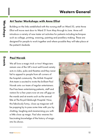 the hospital community. The Artlink Hospital Arts team is excited to invite the brilliant Paul Novak onto our team of regular entertainers. Paul has been entertaining patients, staff and visitors for a few years now at one-off gigs on the wards and at events such as the annual fête at The Royal Edinburgh Hospital. Now, this fabulously funny, close-up magician will be popping by to pass some time with you by chatting, laughing and mesmerizing you with a little close up magic. Paul also weaves his fascinating knowledge of the history of magic into his shows.