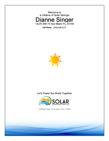 Welcome to a Lifetime of Solar Savings Dianne Singer 14270 SW 73 Ave Miami FL 33158 Cell Phone: (305)238-9127 Let's Power the World Together Certified Solar Contractor CVC 57026
