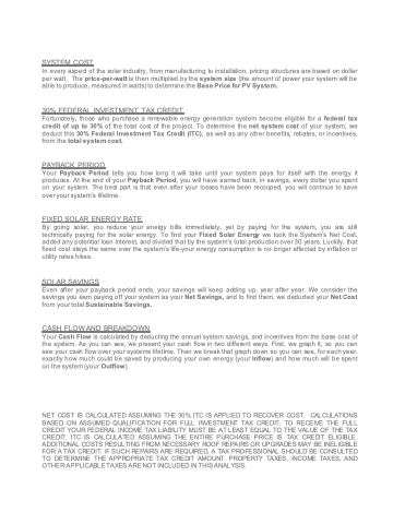NET COST IS CALCULATED ASSUMING THE 30% ITC IS APPLIED TO RECOVER COST. CALCULATIONS BASED ON ASSUMED QUALIFICATION FOR FULL INVESTMENT TAX CREDIT. TO RECEIVE THE FULL CREDIT YOUR FEDERAL INCOME TAX LIABILITY MUST BE AT LEAST EQUAL TO THE VALUE OF THE TAX CREDIT. ITC IS CALCULATED ASSUMING THE ENTIRE PURCHASE PRICE IS TAX CREDIT ELIGIBLE. ADDITIONAL COSTS RESULTING FROM NECESSARY ROOF REPAIRS OR UPGRADES MAY BE INELIGIBLE FOR A TAX CREDIT. IF SUCH REPAIRS ARE REQUIRED, A TAX PROFESSIONAL SHOULD BE CONSULTED TO DETERMINE THE APPROPRIATE TAX CREDIT AMOUNT. PROPERTY TAXES, INCOME TAXES, AND OTHERAPPLICABLETAXESARENOTINCLUDEDINTHISANALYSIS.