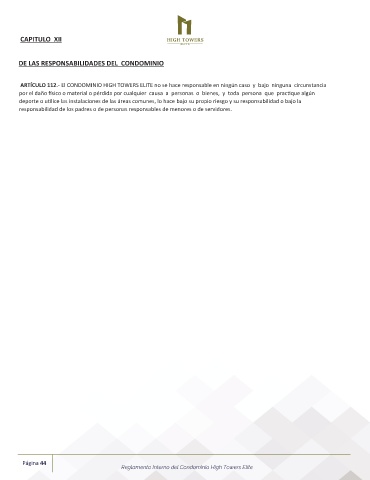 ARTÍCULO 112.- El CONDOMINIO HIGH TOWERS ELITE no se hace responsable en ningún caso y bajo ninguna circunstancia
