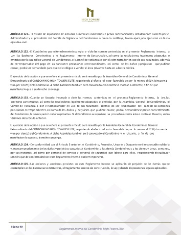 ARTÍCULO 122.- El Condómino que reiteradamente incumpla o viole las normas contenidas en el presente Reglamento Interno, la