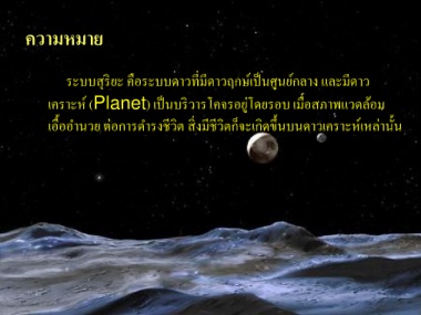 ความหมาย ระบบสุริยะ คือระบบดาวที่มีดาวฤกษ์เป็นศูนย์กลาง และมีดาว เคราะห์ (Planet) เป็นบริวารโคจรอยู่โดยรอบ เมื่อสภาพแวดล้อม เอื้ออ านวย ต่อการด ารงชีวิต สิ่งมีชีวิตก็จะเกิดขึ้นบนดาวเคราะห์เหล่านั้น