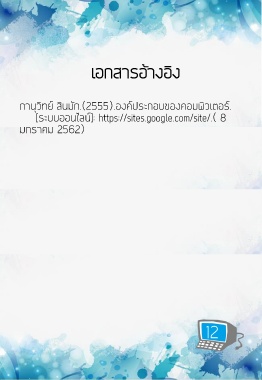 เอกสำรอ้ำงอิง ภำนุวิทย์ สินมัก.(2555).องค์ประกอบของคอมพิวเตอร์. [ระบบออนไลน์]: https://sites.google.com/site/.( 8 มกรำคม 2562) 12