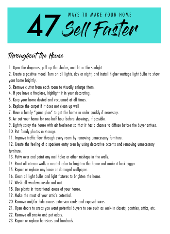 21. Open doors to areas you want potential buyers to see such as walk-in closets, pantries, attics, etc. 22. Remove all smoke and pet odors.