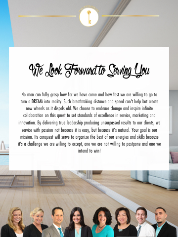 We Look Forward to Serving You No man can fully grasp how far we have come and how fast we are willing to go to turn a DREAM into reality. Such breathtaking distance and speed can't help but create new wheels as it dispels old. We choose to embrace change and inspire infinite collaboration on this quest to set standards of excellence in service, marketing and innovation. By delivering true leadership producing unsurpassed results to our clients, we service with passion not because it is easy, but because it’s natural. Your goal is our mission. Its conquest will serve to organize the best of our energies and skills because it's a challenge we are willing to accept, one we are not willing to postpone and one we intend to win!