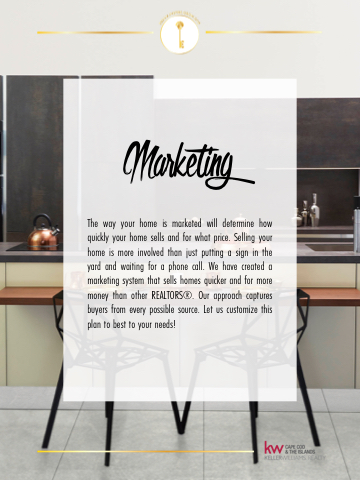 Marketing The way your home is marketed will determine how quickly your home sells and for what price. Selling your home is more involved than just putting a sign in the yard and waiting for a phone call. We have created a marketing system that sells homes quicker and for more money than other REALTORS®. Our approach captures buyers from every possible source. Let us customize this plan to best to your needs!