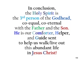 In conclusion, the Holy Spirit is rd the 3 person of the Godhead, co-equal, co-eternal with the Father and the Son. He is our Comforter, Helper, and Guide sent to help us walk/live out this abundant life in Jesus Christ! 186