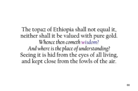 The topaz of Ethiopia shall not equal it, neither shall it be valued with pure gold. Whence then cometh wisdom? And where is the place of understanding? Seeing it is hid from the eyes of all living, and kept close from the fowls of the air. 68