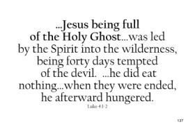 …Jesus being full of the Holy Ghost…was led by the Spirit into the wilderness, being forty days tempted of the devil. …he did eat nothing…when they were ended, he afterward hungered. Luke 4:1-2 137