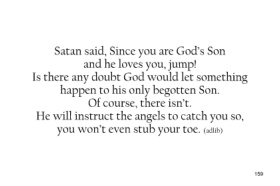 Satan said, Since you are God’s Son and he loves you, jump! Is there any doubt God would let something happen to his only begotten Son. Of course, there isn’t. He will instruct the angels to catch you so, you won’t even stub your toe. (adlib) 159
