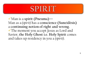 ✓Man is a spirit (Pneuma)— Man as a (spirit) has a conscience (Suneidésis) a continuing notion of right and wrong. ✓The moment you accept Jesus as Lord and Savior, the Holy Ghost i.e. Holy Spirit comes and takes up residency in you a (spirit). 5