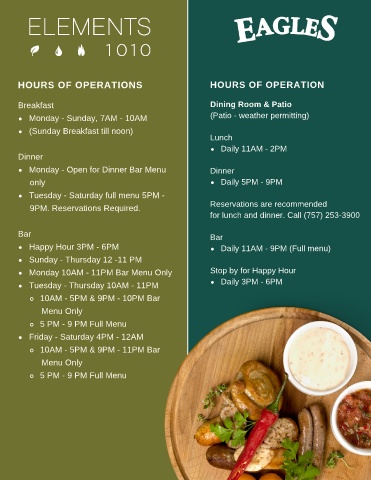 Monday 10AM - 11PM Bar Menu Only Stop by for Happy Hour