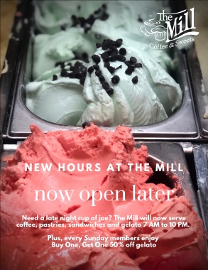 N E W H O U R S A T T H E M I L L now open later Need a late night cup of joe? The Mill will now serve coffee, pastries, sandwiches and gelato 7 AM to 10 PM. Plus, every Sunday members enjoy Buy One, Get One 50% off gelato