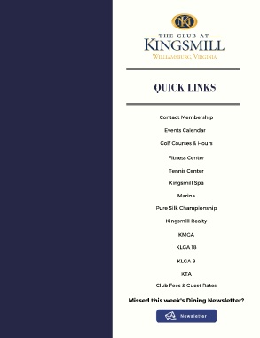 QUICK LINKS Contact Membership Events Calendar Golf Courses & Hours Fitness Center Tennis Center Kingsmill Spa Marina Pure Silk Championship Kingsmill Realty KMGA KLGA 18 KLGA 9 KTA Club Fees & Guest Rates Missed this week's Dining Newsletter?