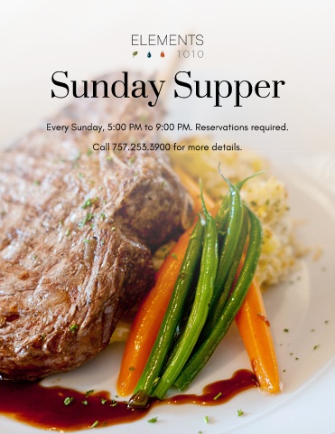 Sunday Supper Every Sunday, 5:00 PM to 9:00 PM. Reservations required. Call 757.253.3900 for more details.