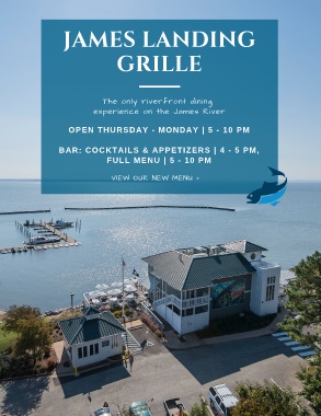 JAMES LANDING GRILLE The only riverfront dining experience on the James River OPEN THURSDAY - MONDAY | 5 - 10 PM BAR: COCKTAILS & APPETIZERS | 4 - 5 PM, FULL MENU | 5 - 10 PM VIEW OUR NEW MENU >