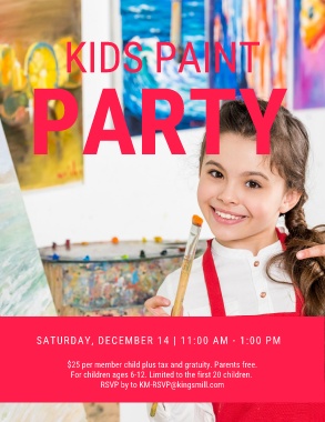 KIDS PAINT PARTY SATURDAY, DECEMBER 14 | 11:00 AM - 1:00 PM $25 per member child plus tax and gratuity. Parents free. For children ages 6-12. Limited to the first 20 children. RSVP by to KM-RSVP@kingsmill.com