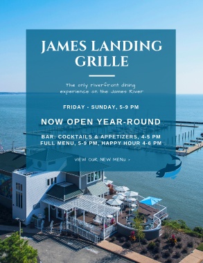 JAMES LANDING GRILLE The only riverfront dining experience on the James River FRIDAY - SUNDAY, 5-9 PM NOW OPEN YEAR-ROUND BAR: COCKTAILS & APPETIZERS, 4-5 PM FULL MENU, 5-9 PM, HAPPY HOUR 4-6 PM VIEW OUR NEW MENU >