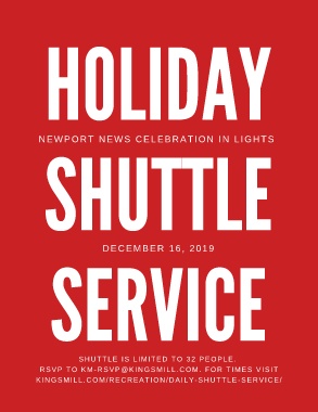 SHSERV HOLIDUTTLEICE NEWPORT NEWS CELEBRATION IN LIGHTS DECEMBER 16, 2019 SHUTTLE IS LIMITED TO 32 PEOPLE. RSVP TO KM-RSVP@KINGSMILL.COM. FOR TIMES VISIT KINGSMILL.COM/RECREATION/DAILY-SHUTTLE-SERVICE/