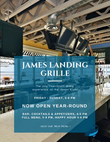 JAMES LANDING GRILLE The only riverfront dining experience on the James River FRIDAY - SUNDAY, 5-9 PM NOW OPEN YEAR-ROUND BAR: COCKTAILS & APPETIZERS, 4-5 PM FULL MENU, 5-9 PM, HAPPY HOUR 4-6 PM VIEW OUR NEW MENU >