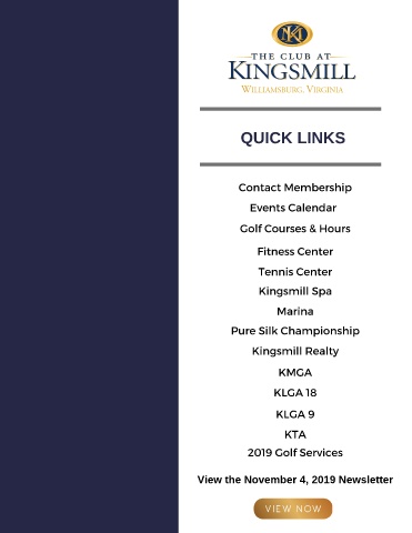 QUICK LINKS Contact Membership Events Calendar Golf Courses & Hours Fitness Center Tennis Center Kingsmill Spa Marina Pure Silk Championship Kingsmill Realty KMGA KLGA 18 KLGA 9 KTA 2019 Golf Services View the November 4, 2019 Newsletter