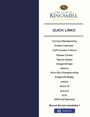 QUICK LINKS Contact Membership Events Calendar Golf Courses & Hours Fitness Center Tennis Center Kingsmill Spa Marina Pure Silk Championship Kingsmill Realty KMGA KLGA 18 KLGA 9 KTA 2019 Golf Services Missed the last newsletter?