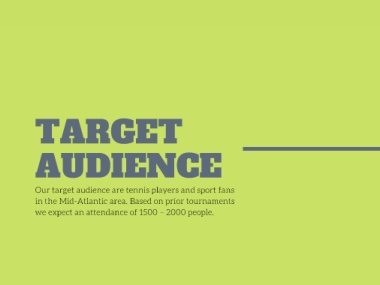 TARGET AUDIENCE Our target audience are tennis players and sport fans in the Mid-Atlantic area. Based on prior tournaments we expect an attendance of 1500 – 2000 people.