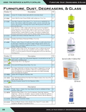 2020 PMI SERVICE & SUPPLY CATALOG Furniture, Dust, Degreasers, & Glass Furniture, Dust, Degreasers, & Glass LF-0010 LF-0110 Special order 5 Gallon Pail LD-0110 LG-0030 33 EMAIL US YOUR ORDER AT: ORDER@PMIGOGREEN.COM