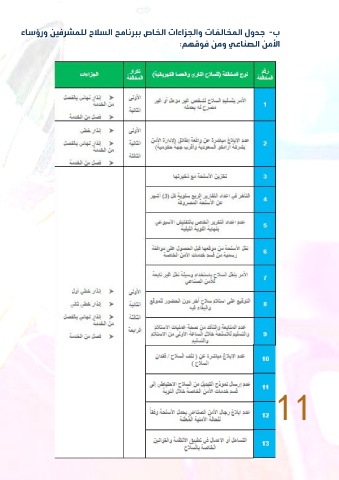 ب -جدول المخالفات والجزاءات الخاص ببرنامج السلاح للمشرفين ورؤساء الأمن الصناعي ومن فوقهم: 11